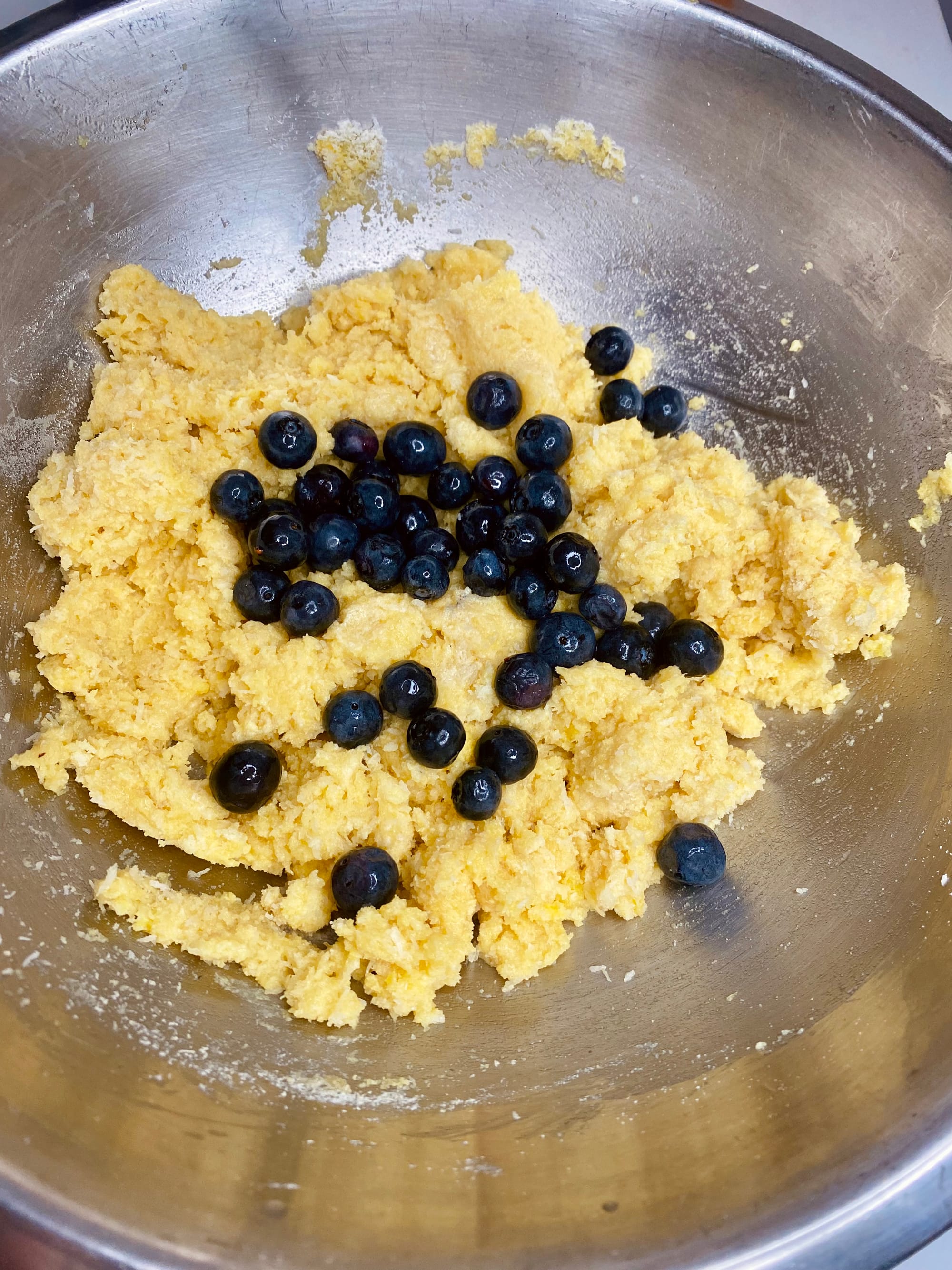 Evenly divide the batter among the muffin cups being conscience that each muffin has a few blueberries in each scoop.