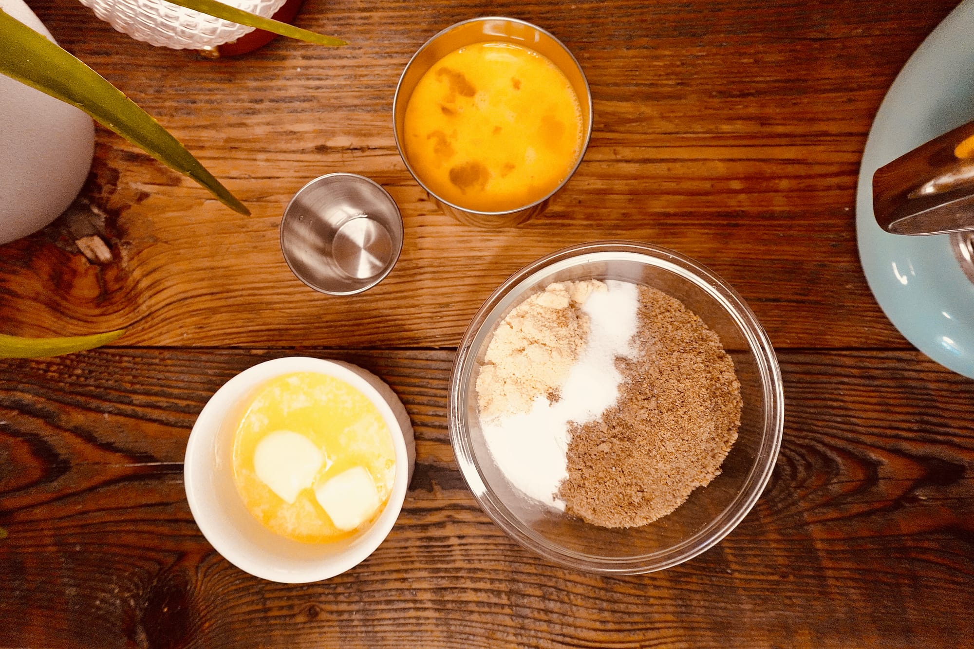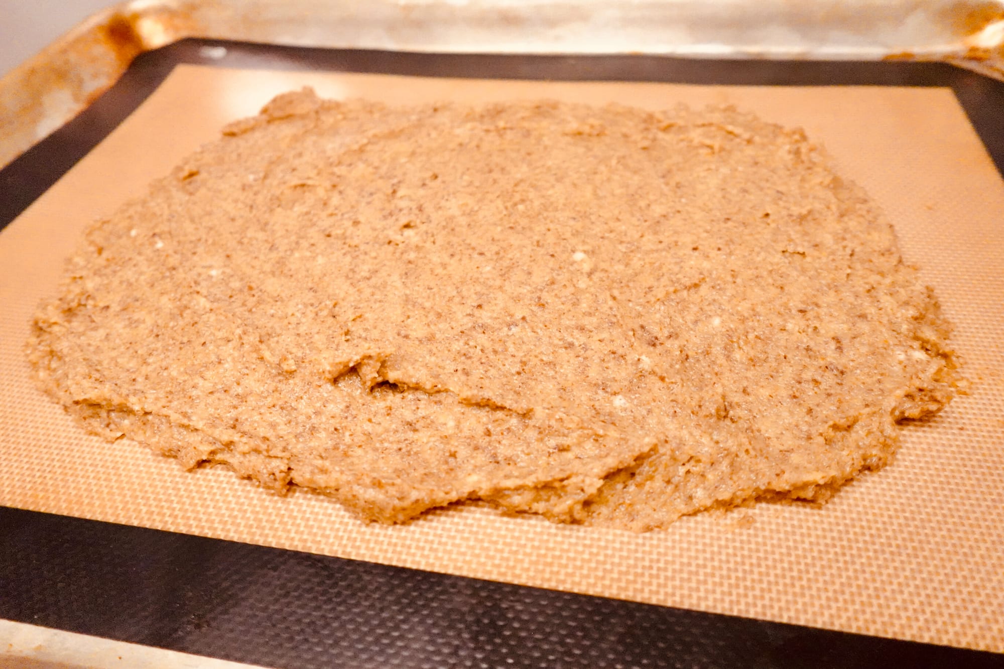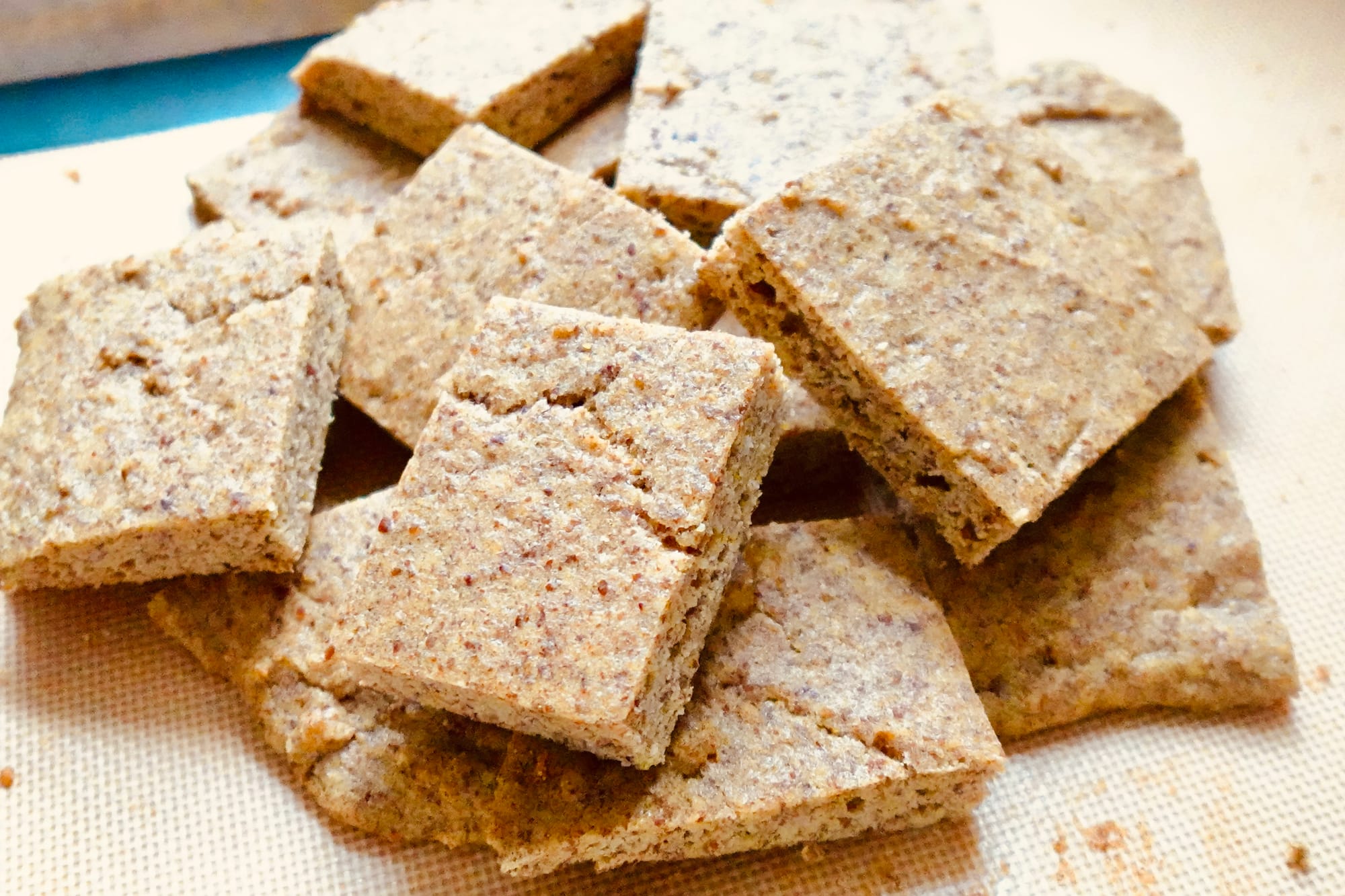 Mix together all the dry ingredients in one bowl and all the wet ingredients in another, then combine both into one bowl. Spread your mixture into a lined 8x8 glass baking dish or onto a lined cookie sheet. Using a spatula, or the back of a spoon, spread the mixture evenly ensuring it is all the same thickness. Bake at 350° for 8–10 minutes. Cut with a knife then lift with a spatula.