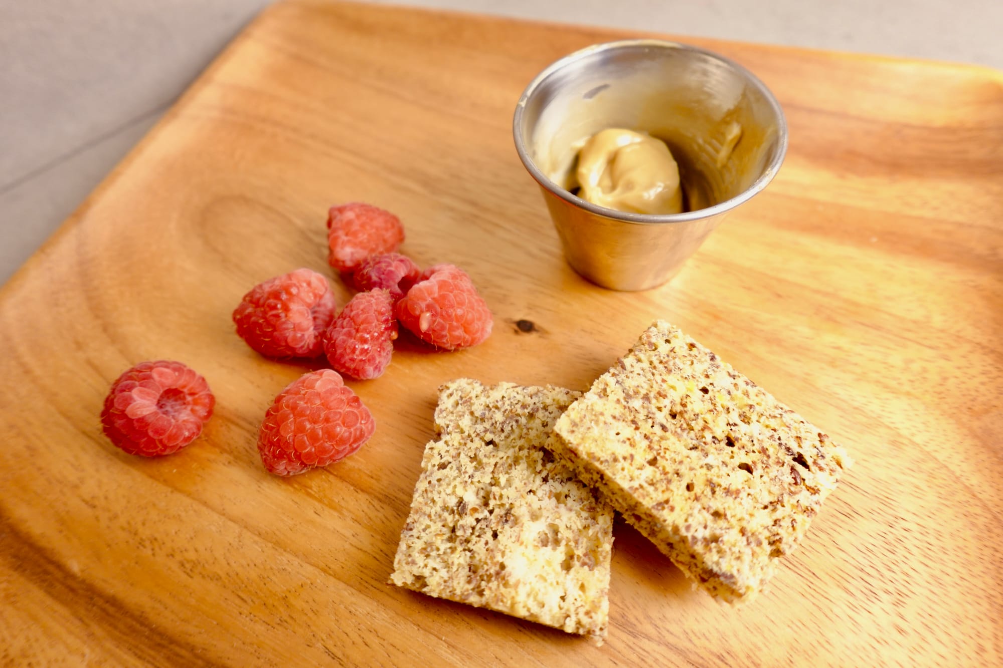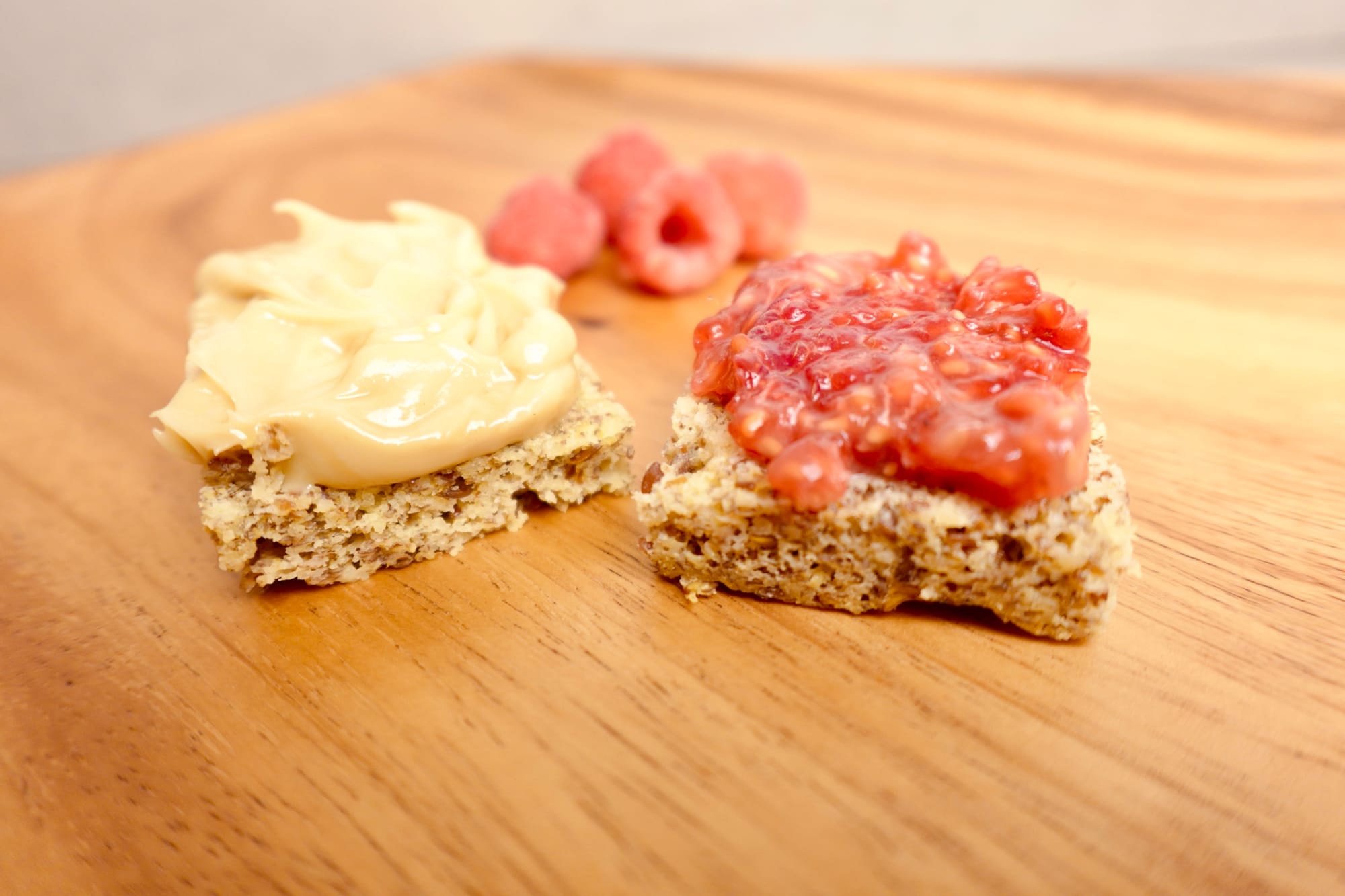 So the rest is pretty straight foward from here. I use a small dish to thoroughly combine the room temperature butter with the sunflower seed butter then spread it directly onto my pre-cut bread (see notes above). I weigh out my fruit of choice then in a small bowl smash a portion of the berries to create a "jelly" and reserve the rest to be eaten on the side. You can add a small pinch of non-nutritive sweetener to your jelly however this step is optional. Layer the jelly onto the sunflower butter mixture and top with the other slice of flax bread.