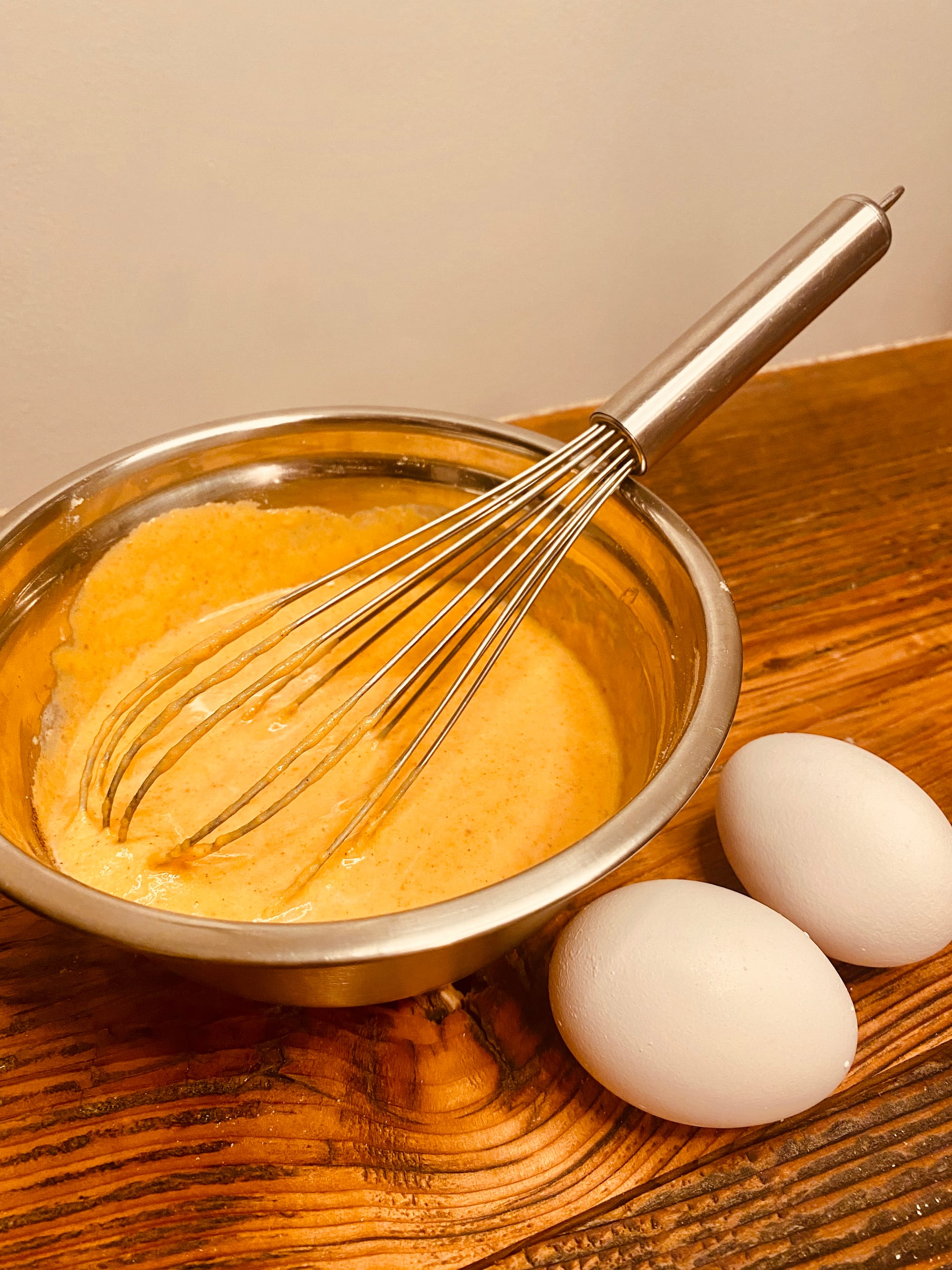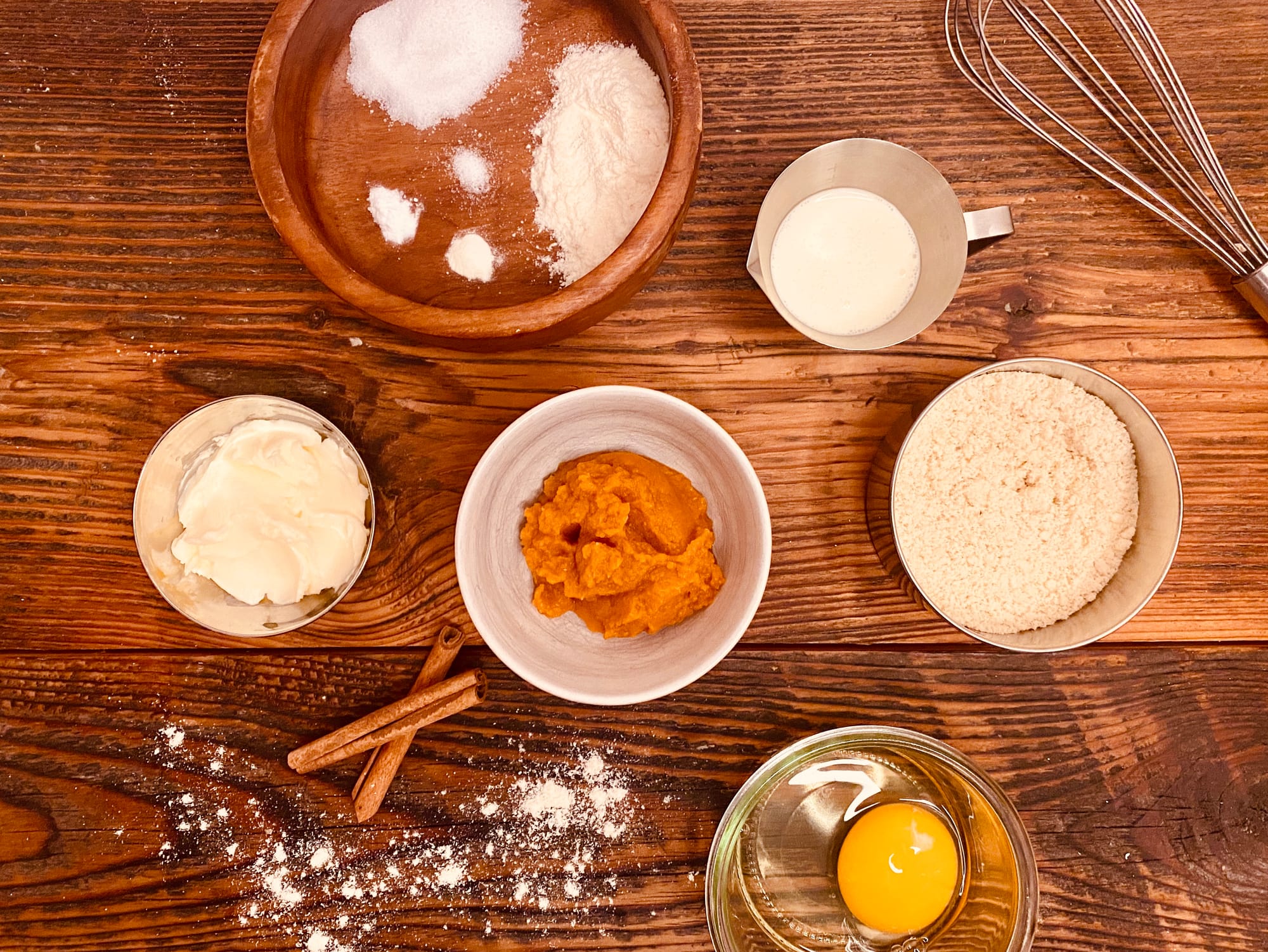 - Combine the egg yolk, pumpkin puree, heavy cream, cinnamon, Truvia and salt in a small bowl. Whisk the ingredients together very well. Divide the batter into 4 portions, about 35 grams each, and pour the mixture into each pie crust.