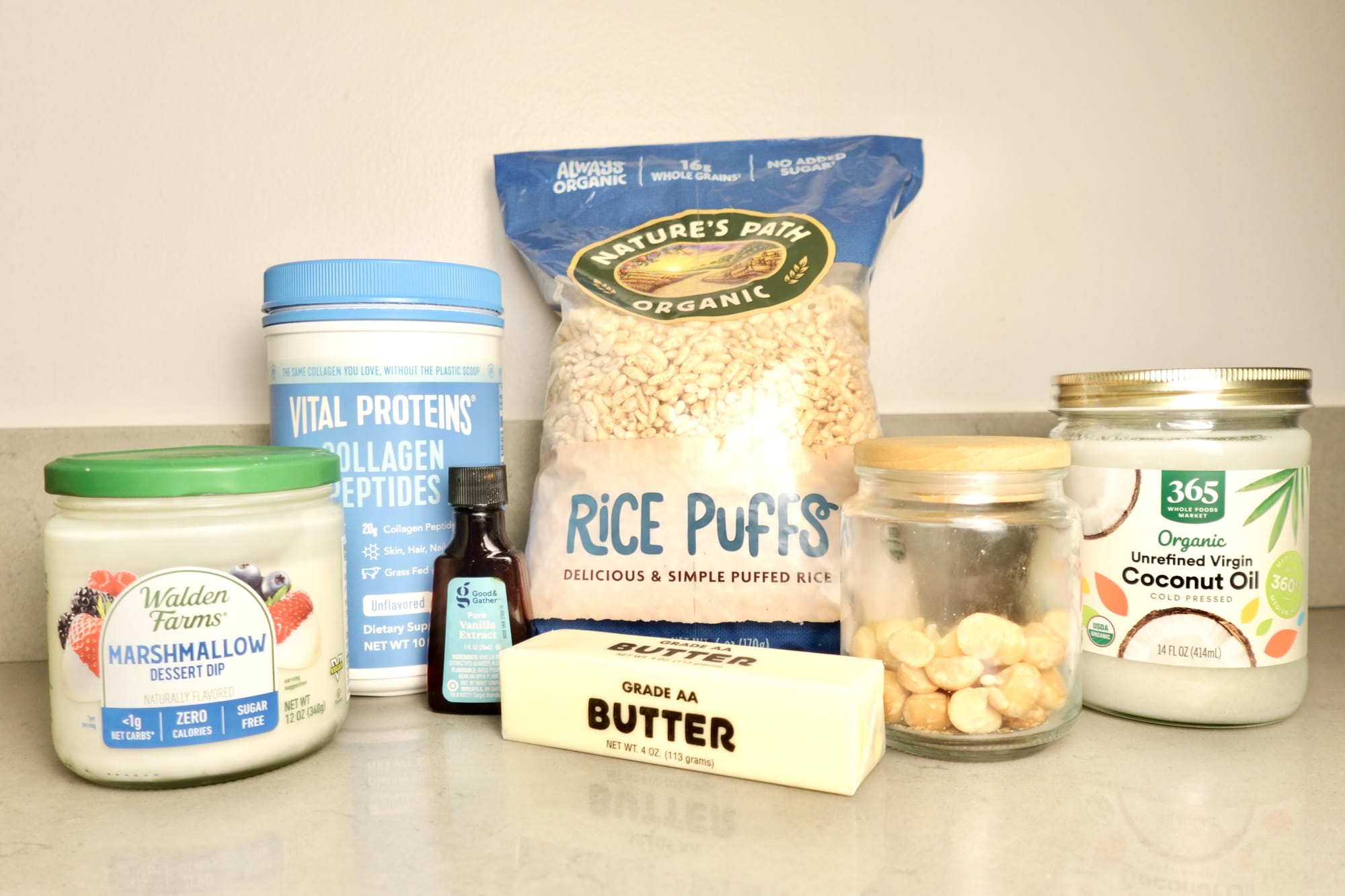 **I did the coconut oil this way because I found that trying to incorporate melted butter, marshmallow dip and melted coconut oil with the puffed rice made them very soggy. So I ultimately decided to layer them on separately for a better texture.